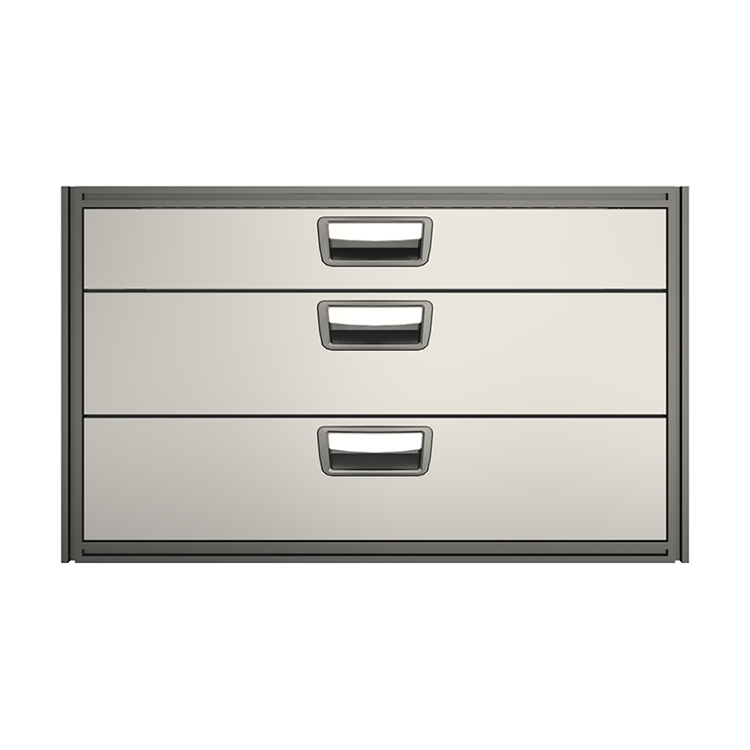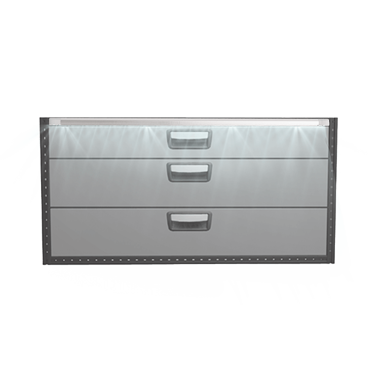 The drawer units are modular in width, depth and height, and can easily be combined with other products in the range. The frame's integrated T-tracks can be used for securing cargo, attaching accessories, and for versatile surface mounting. Each drawer is fitted with ball bearing runners as standard. The drawers are fully extendable and equipped with stoppers. To help optimize the weight, cover panels and tool boards are optional.