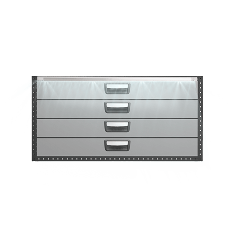The drawer units are modular in width, depth and height, and can easily be combined with other products in the range. The frame's integrated T-tracks can be used for securing cargo, attaching accessories, and for versatile surface mounting. Each drawer is fitted with ball bearing runners as standard. The drawers are fully extendable and equipped with stoppers. To help optimize the weight, cover panels and tool boards are optional.