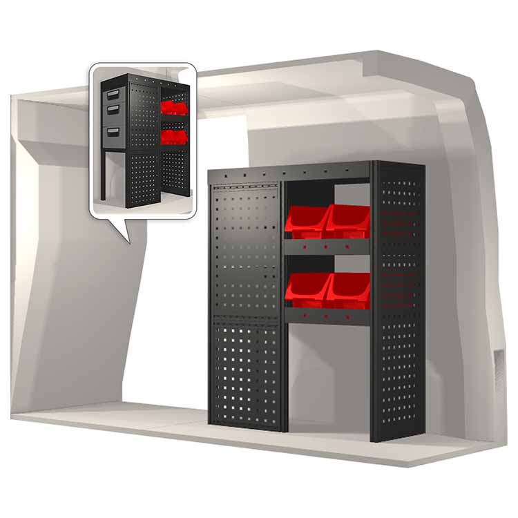 The racking has been specially designed to ensure the optimum fit to the vehicle, as well as the best possible functionality and safety. It has been developed for professional use, is flexible and is intended for service jobs in various types of business. All shelves are equipped with rubber mats, and all drawers with foam plastic liners. Assembly material is included.
