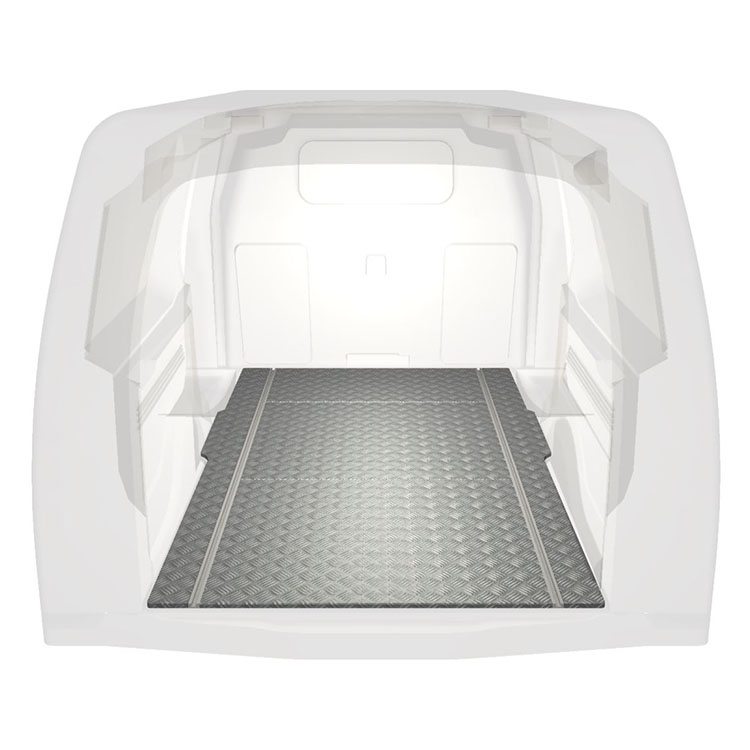 Lightweight and robust standard van floor for a Berlingo/Partner/Combo 19- with anti-slip aluminum tread plate and cargo rails (longitudinal) for quick and safe installation of racking systems and other accessories.