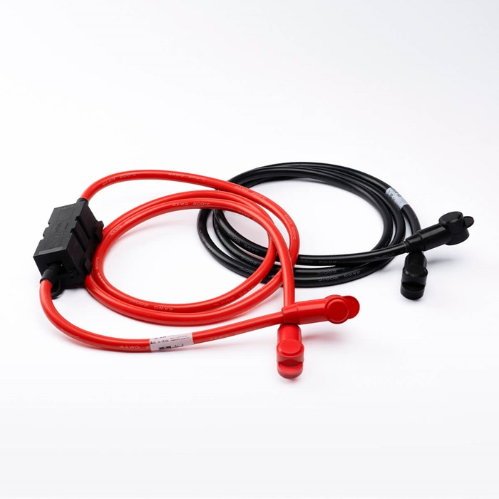 2-meter battery cables designed for the 28410-03 e-Heate 1000. Pre-fitted with M8 ring terminals, pole protection caps, fuse holder, and fuse.