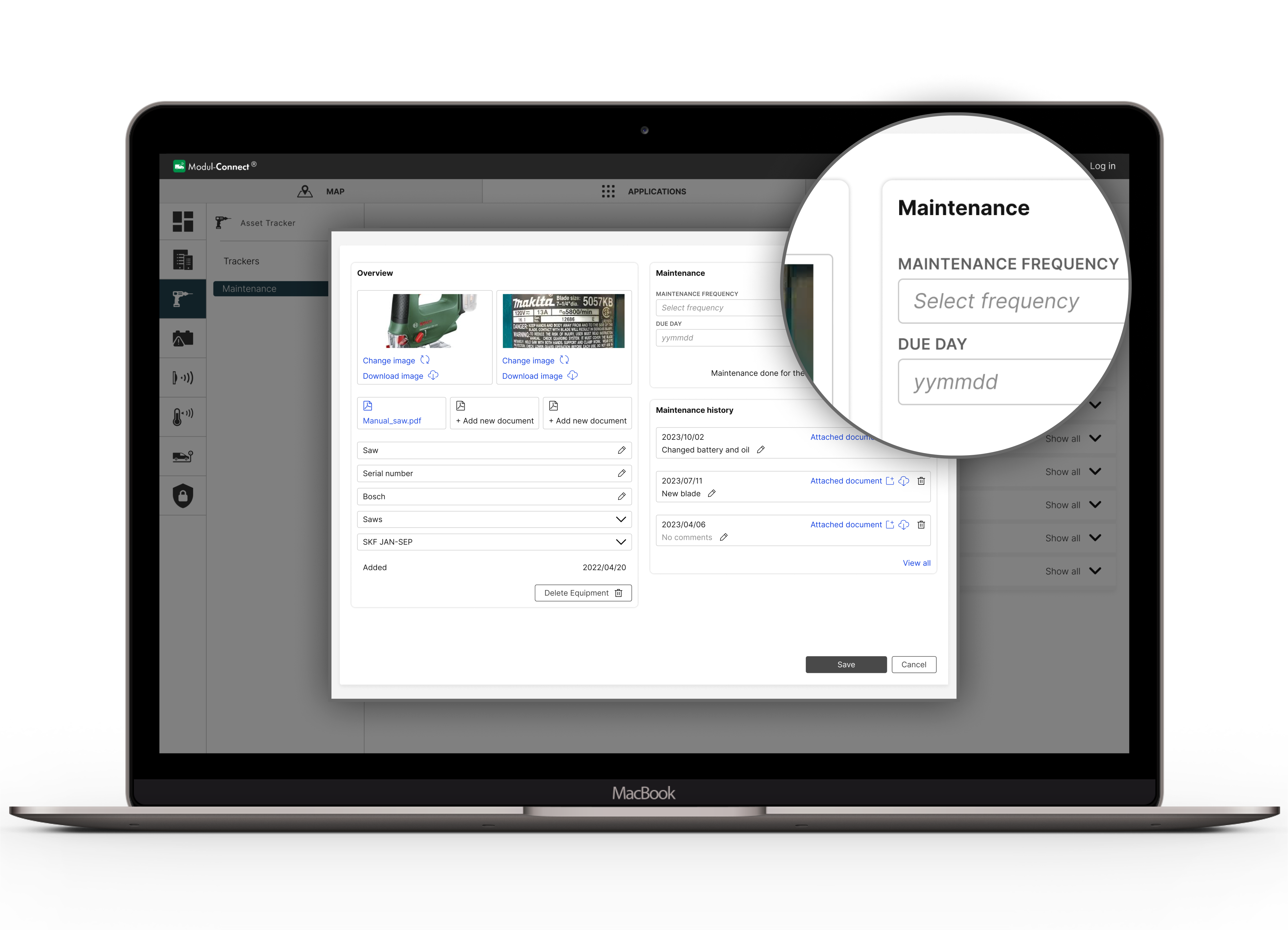 In the Customer Portal, you can immediately see if a vehicle has misplaced a tool and which tools are linked to which vehicle. Add maintenance for both tracked tools and tools/equipment without trackers. All information – including ID numbers, images, and maintenance data – is available and easy to access in the portal, giving you full control and overview.
