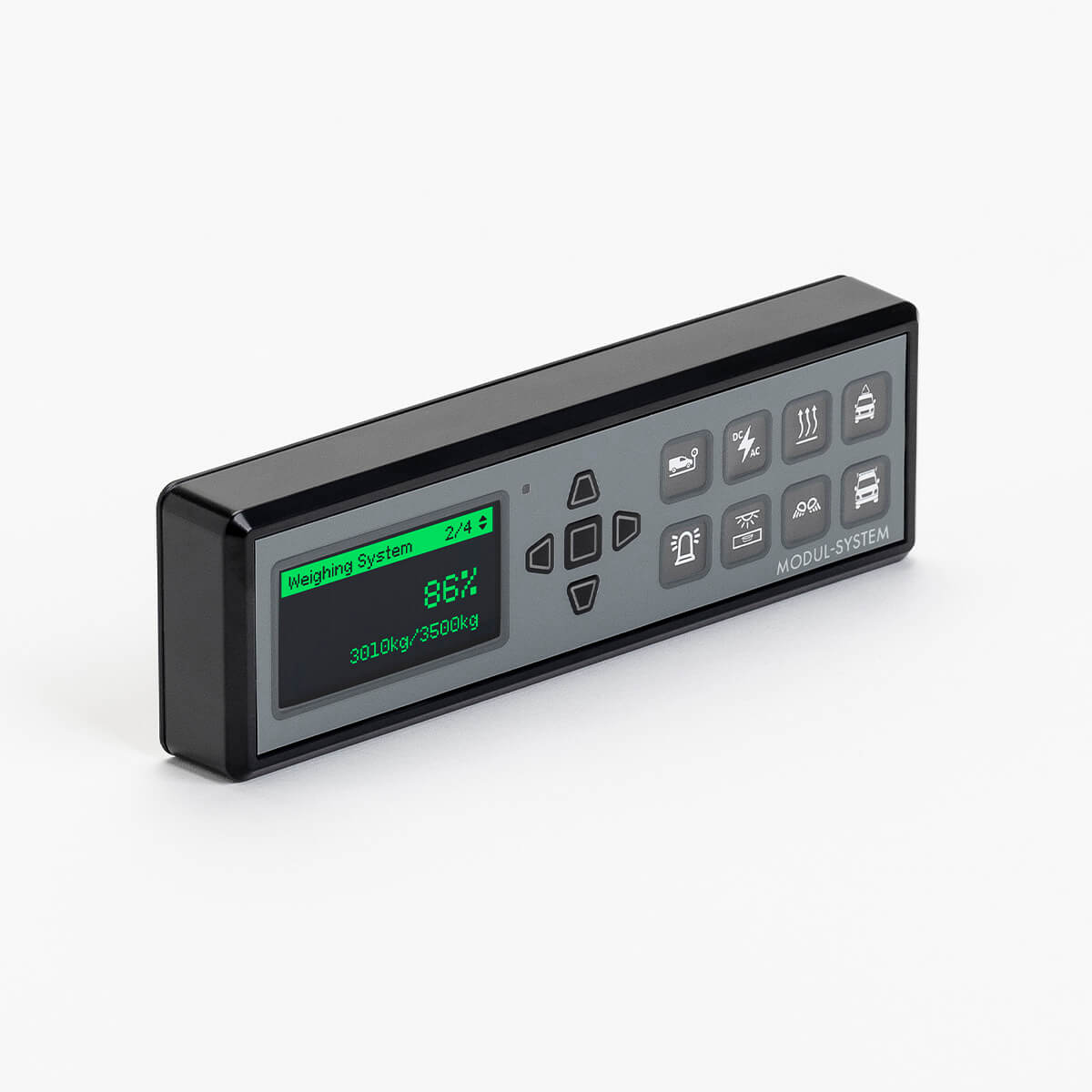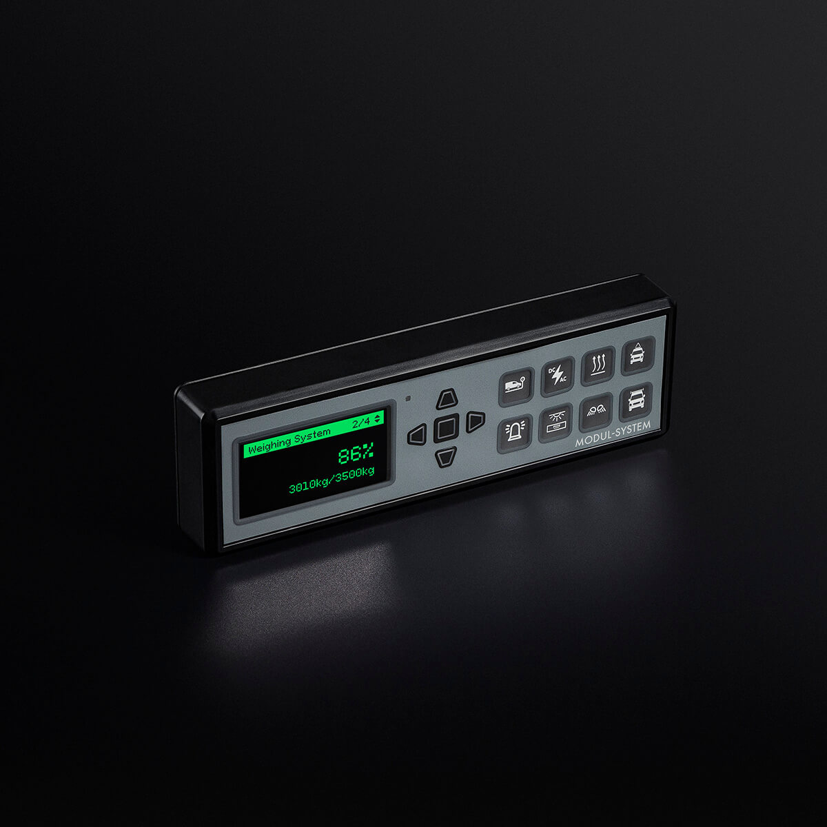 Display switch panel with OLED screen designed to fit in the cab area of the vehicle. Backlit switches make it easy for the driver to see which accessories are turned on.