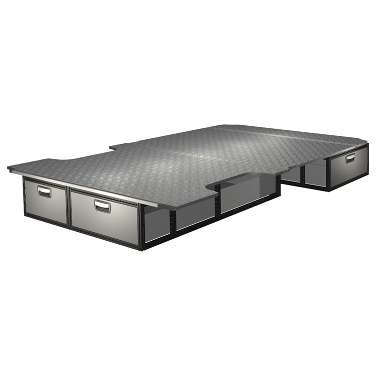 The kit is designed to be fitted on top of a wooden floor. The double floor is equipped with rails for easy installation of vehicle racking, and edging strips for a nice finish.