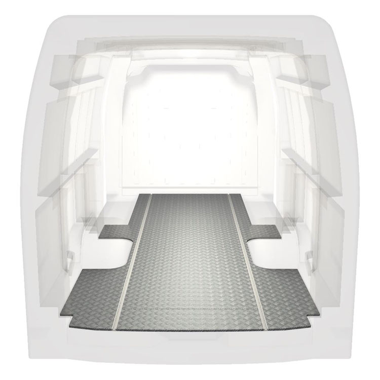 Lightweight and robust extra long floor for a Renault Master / Opel Movano / Nissan NV400 with anti-slip aluminum tread plate and cargo rails (longitudinal) for quick and safe installation of racking systems and other accessories.