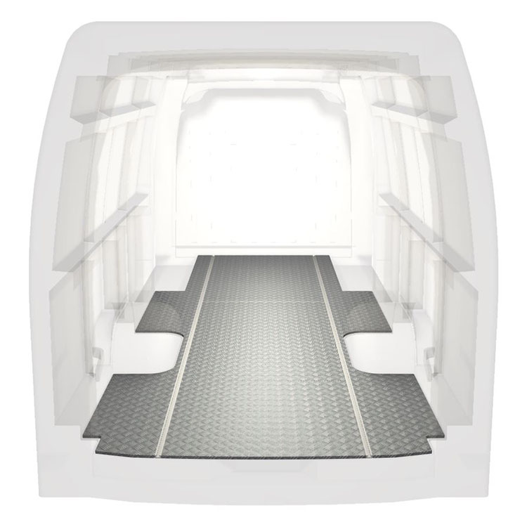 Lightweight and robust extra long floor for a Renault Master / Opel Movano / Nissan NV400 with anti-slip aluminum tread plate and cargo rails (longitudinal) for quick and safe installation of racking systems and other accessories.
