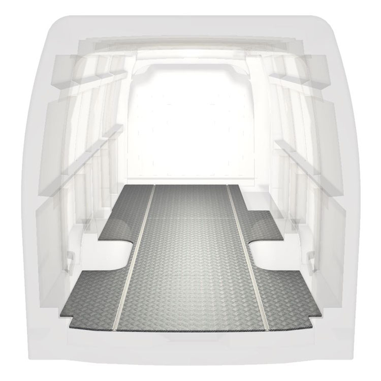 Lightweight and robust extra long floor for a Renault Master / Opel Movano / Nissan NV400 with anti-slip aluminum tread plate and cargo rails (longitudinal) for quick and safe installation of racking systems and other accessories.