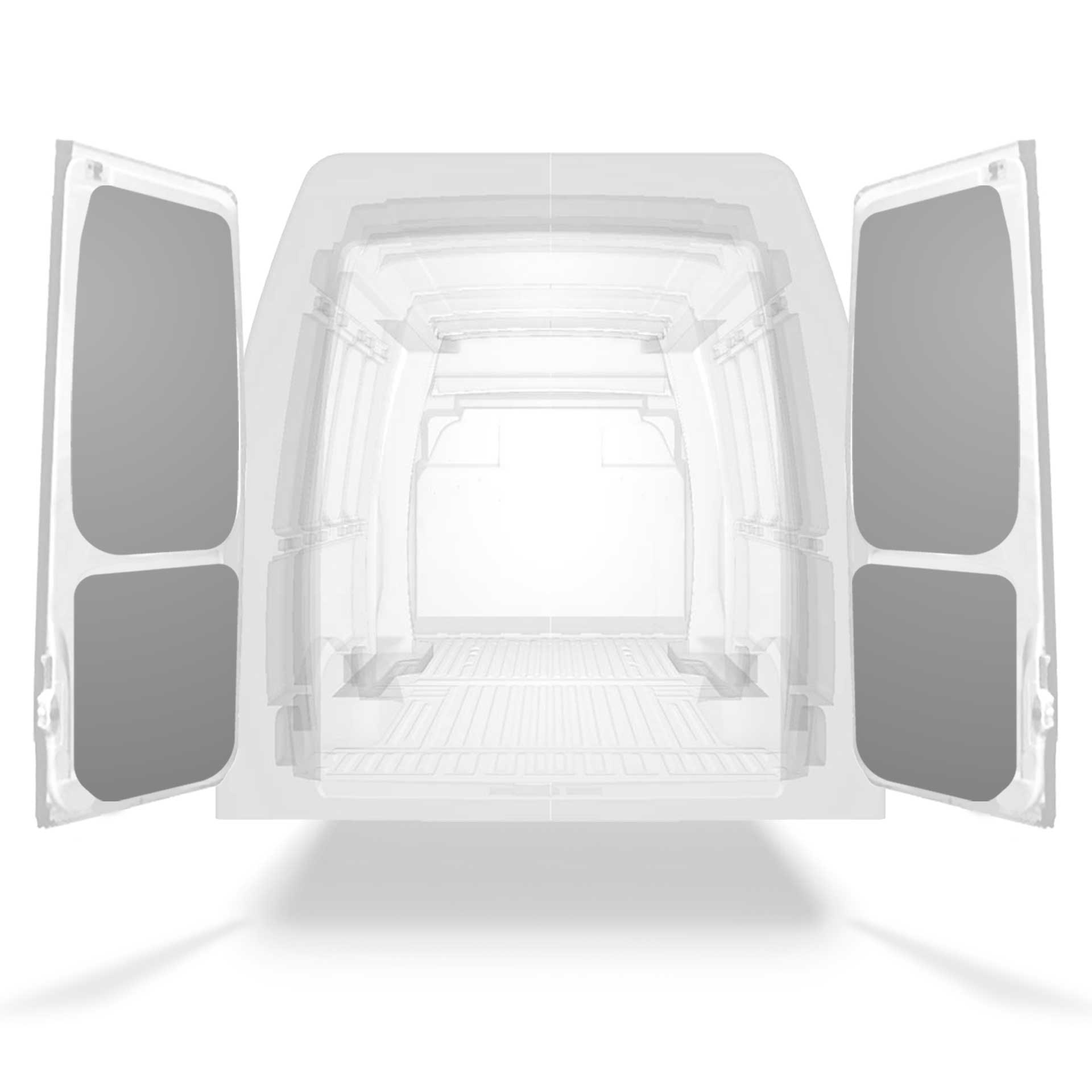 The rear door linings are designed and fabricated to fit in the sections of the rear door/tailgate of the vehicle to minimize weight. The liners protect the vehicle, create a bright working environment and are easy to wipe clean.