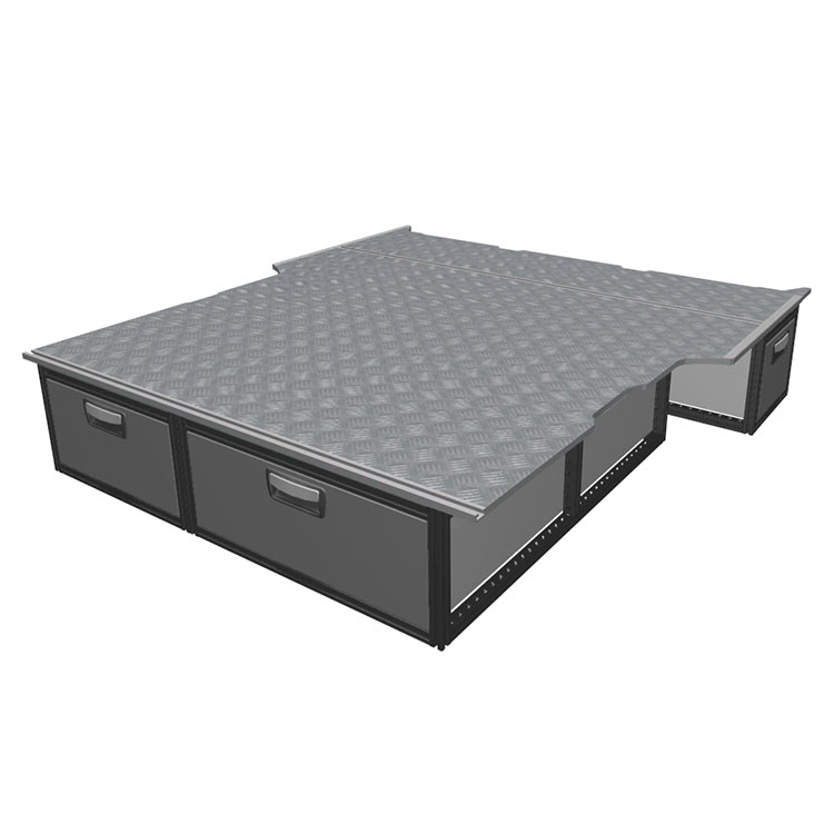 The kit is designed to be fitted on top of a Modul-Floor, utilizing the floor rails for a non-intrusive installation. The double floor is equipped with rails for easy installation of vehicle racking, and edging strips for a nice finish.