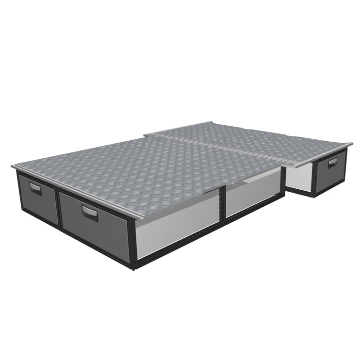 The kit is designed to be fitted on top of a Modul-Floor, utilizing the floor rails for a non-intrusive installation. The double floor is equipped with rails for easy installation of vehicle racking, and edging strips for a nice finish.