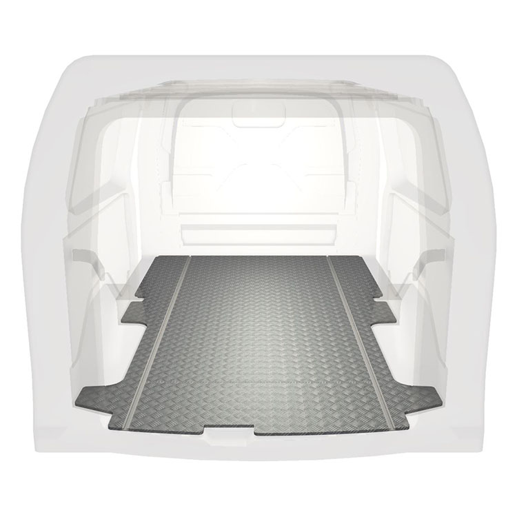 Lightweight and robust standard van floor for a Ford Transit Custom with anti-slip aluminum tread plate and cargo rails (longitudinal) for quick and safe installation of racking systems and other accessories.