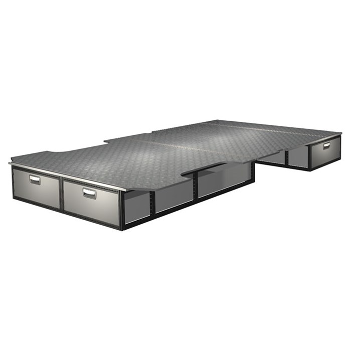 The kit is designed to be fitted on top of a wooden floor. The double floor is equipped with rails for easy installation of vehicle racking, and edging strips for a nice finish.