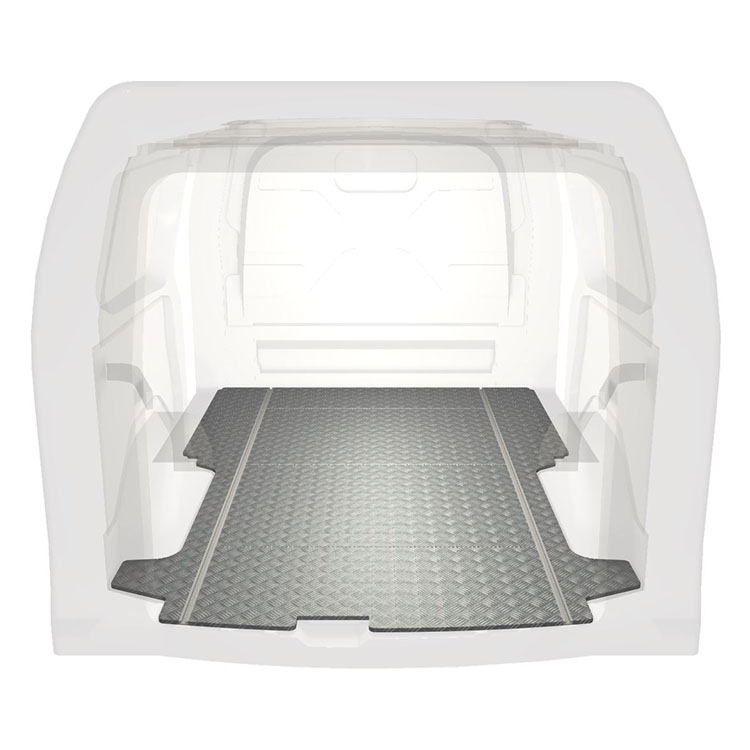 Lightweight and robust standard van floor for a Ford Transit Custom with anti-slip aluminum tread plate and cargo rails (longitudinal) for quick and safe installation of racking systems and other accessories.