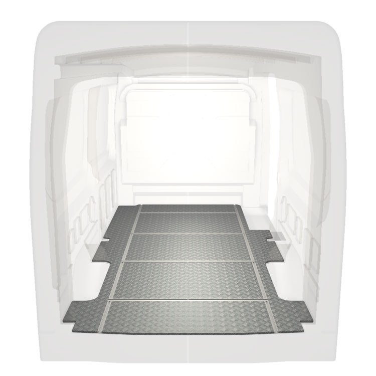 Lightweight and robust van floor with transverse rails for a Ford Transit with anti-slip aluminum tread plate and cargo rails (longitudinal and transverse) for quick and safe installation of racking systems and other accessories.