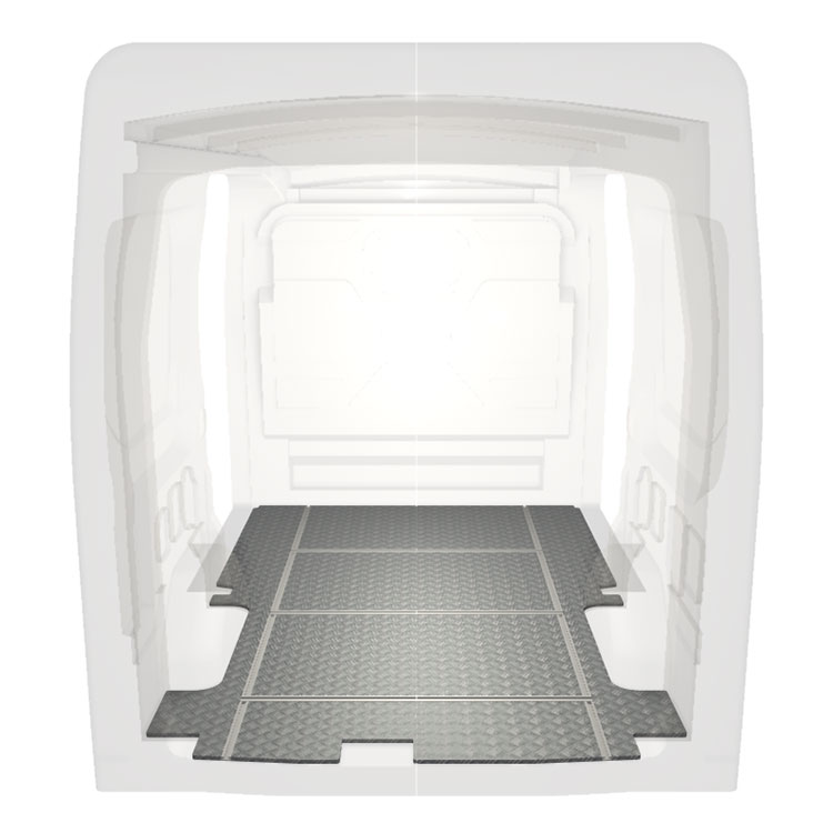 Lightweight and robust van floor with transverse rails for a Ford Transit with anti-slip aluminum tread plate and cargo rails (longitudinal and transverse) for quick and safe installation of racking systems and other accessories.