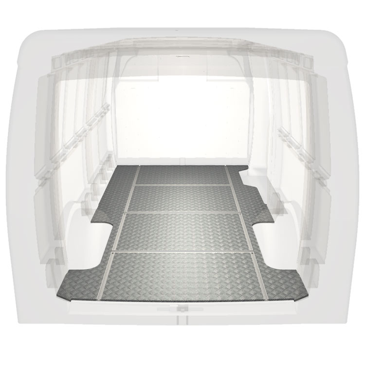 Lightweight and robust van floor with transverse rails for a Iveco Daily with anti-slip aluminum tread plate and cargo rails (longitudinal and transverse) for quick and safe installation of racking systems and other accessories.