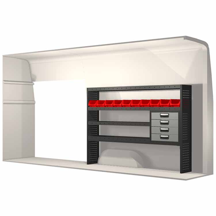 The racking has been specially designed to ensure the optimum fit to the vehicle, as well as the best possible functionality and safety. It has been developed for professional use, is flexible and is intended for service jobs in various types of business. All shelves are equipped with rubber mats, and all drawers with foam plastic liners. Assembly material is included.