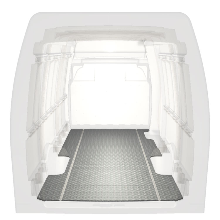 Lightweight and robust standard van floor for a Iveco Daily with anti-slip aluminum tread plate and cargo rails (longitudinal) for quick and safe installation of racking systems and other accessories.
