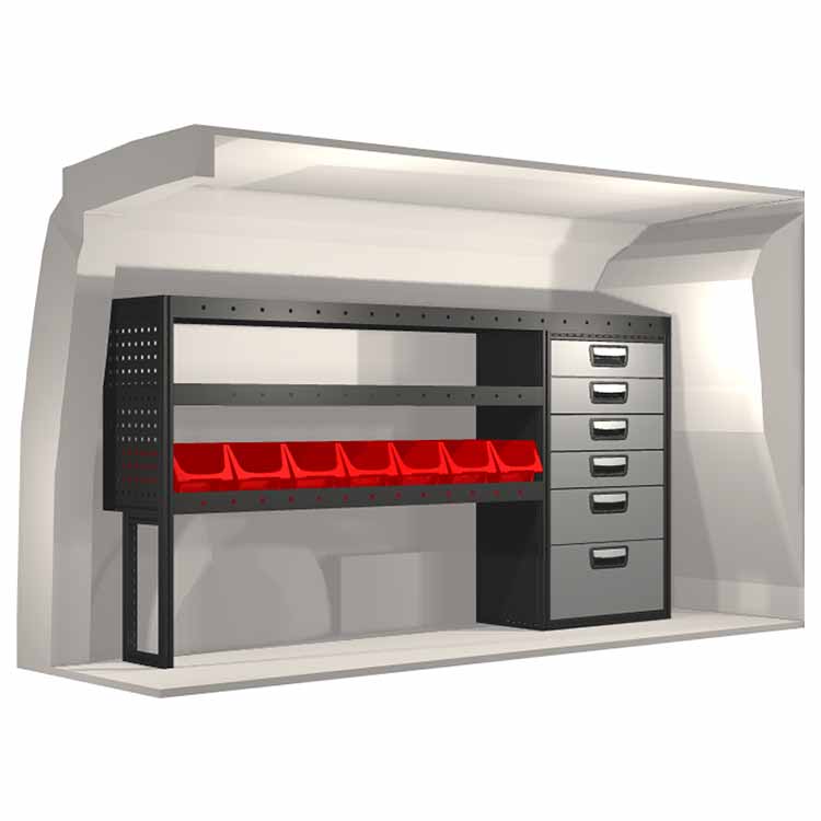The racking has been specially designed to ensure the optimum fit to the vehicle, as well as the best possible functionality and safety. It has been developed for professional use, is flexible and is intended for service jobs in various types of business. All shelves are equipped with rubber mats, and all drawers with foam plastic liners. Assembly material is included.