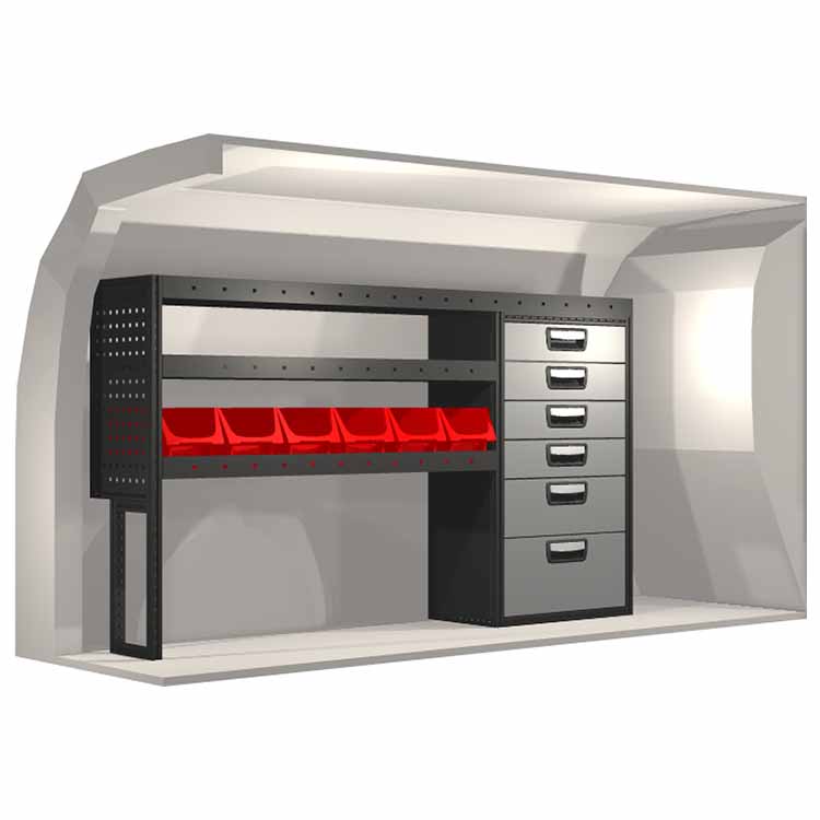 The racking has been specially designed to ensure the optimum fit to the vehicle, as well as the best possible functionality and safety. It has been developed for professional use, is flexible and is intended for service jobs in various types of business. All shelves are equipped with rubber mats, and all drawers with foam plastic liners. Assembly material is included.