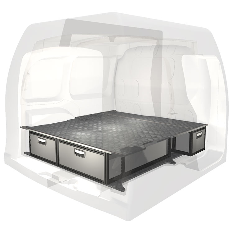 The kit is designed to be fitted on top of a Modul-Floor, utilizing the floor rails for a non-intrusive installation. The double floor is equipped with rails for easy installation of vehicle racking, and edging strips for a nice finish.