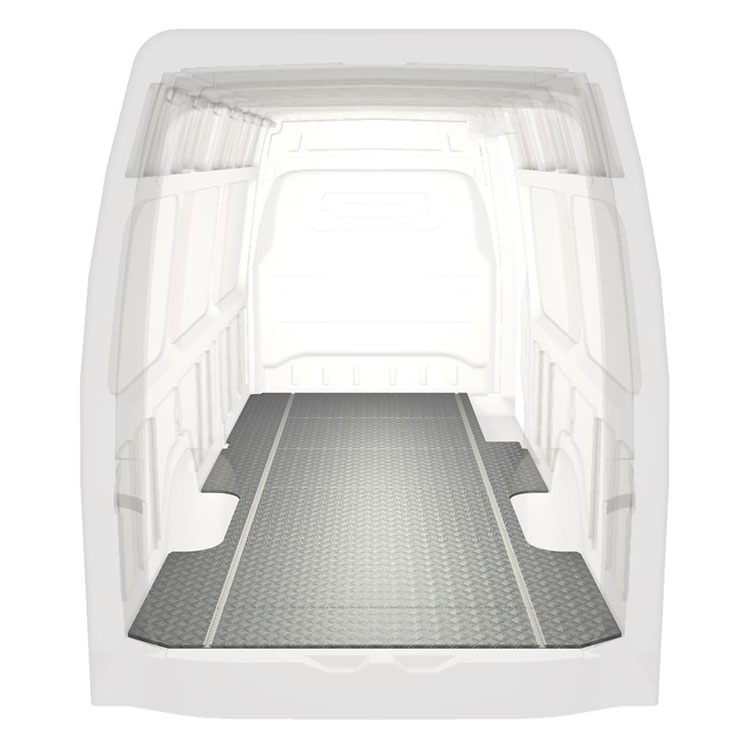Lightweight and robust standard van floor for a Mercedes Sprinter with anti-slip aluminum tread plate and cargo rails (longitudinal) for quick and safe installation of racking systems and other accessories.