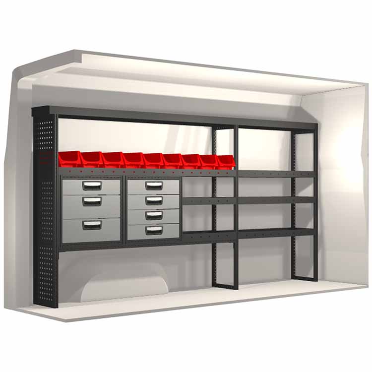 The racking has been specially designed to ensure the optimum fit to the vehicle, as well as the best possible functionality and safety. It has been developed for professional use, is flexible and is intended for service jobs in various types of business. All shelves are equipped with rubber mats, and all drawers with foam plastic liners. Assembly material is included.