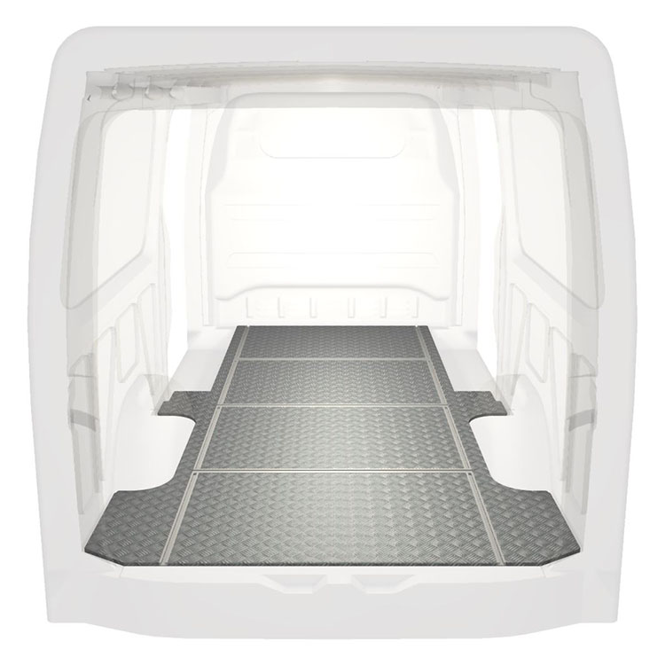 Lightweight and robust van floor with transverse rails for a Mercedes Sprinter with anti-slip aluminum tread plate and cargo rails (longitudinal and transverse) for quick and safe installation of racking systems and other accessories.