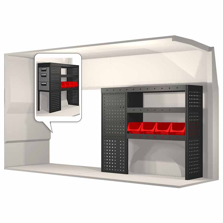 The racking has been specially designed to ensure the optimum fit to the vehicle, as well as the best possible functionality and safety. It has been developed for professional use, is flexible and is intended for service jobs in various types of business. All shelves are equipped with rubber mats, and all drawers with foam plastic liners. Assembly material is included.