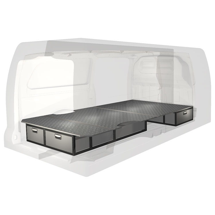 The kit is designed to be fitted on top of a wooden floor. The double floor is equipped with rails for easy installation of vehicle racking, and edging strips for a nice finish.