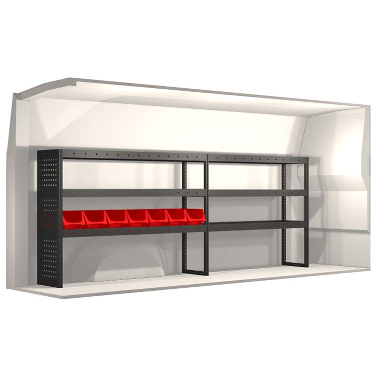 The racking has been specially designed to ensure the optimum fit to the vehicle, as well as the best possible functionality and safety. It has been developed for professional use, is flexible and is intended for service jobs in various types of business. All shelves are equipped with rubber mats, and all drawers with foam plastic liners. Assembly material is included.