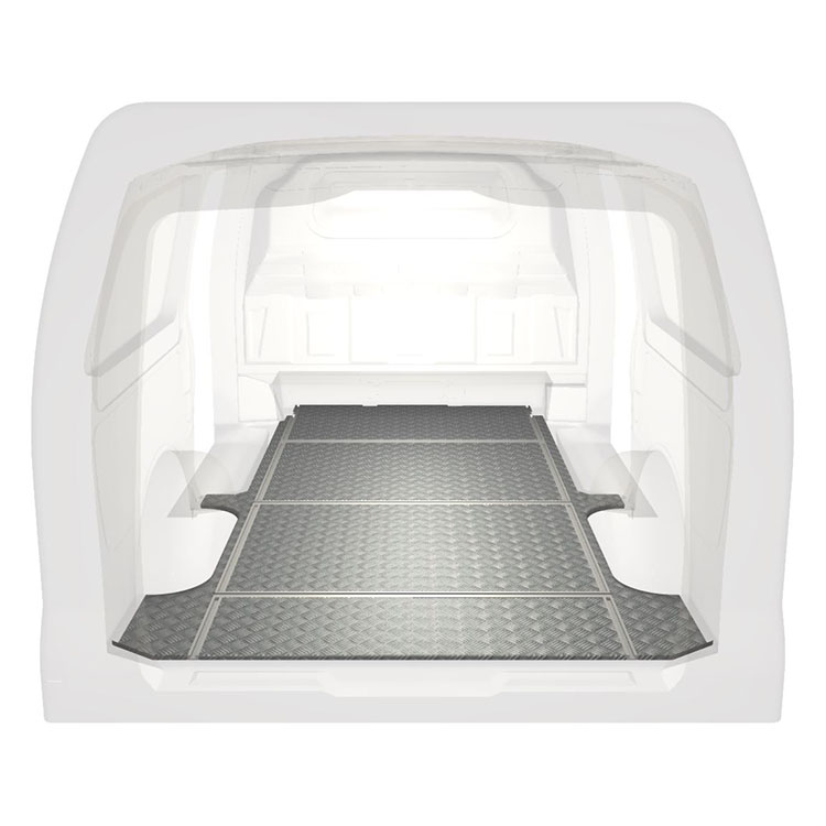 Lightweight and robust van floor with transverse rails for a Mercedes Vito with anti-slip aluminum tread plate and cargo rails (longitudinal and transverse) for quick and safe installation of racking systems and other accessories.