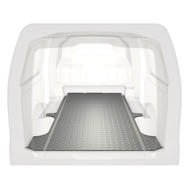 Lightweight and robust standard van floor for a Mercedes Vito with anti-slip aluminum tread plate and cargo rails (longitudinal) for quick and safe installation of racking systems and other accessories.
