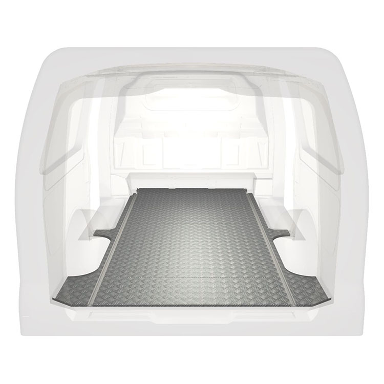 Lightweight and robust extra long floor for a Mercedes Vito with anti-slip aluminum tread plate and cargo rails (longitudinal) for quick and safe installation of racking systems and other accessories.