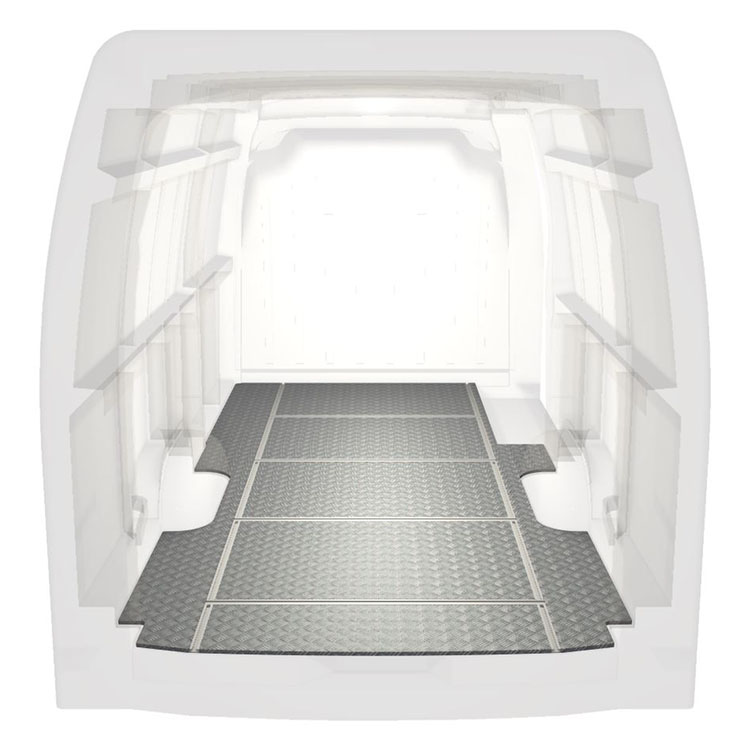 Lightweight and robust van floor with transverse rails for a Renault Master / Opel Movano / Nissan NV400 with anti-slip aluminum tread plate and cargo rails (longitudinal and transverse) for quick and safe installation of racking systems and other accessories.