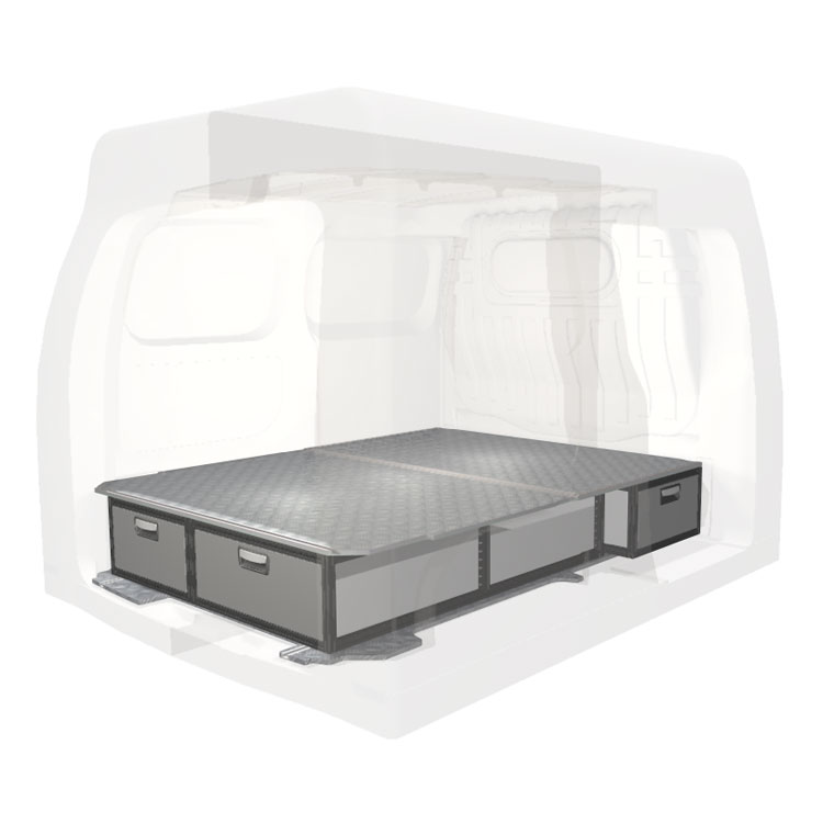 The kit is designed to be fitted on top of a Modul-Floor, utilizing the floor rails for a non-intrusive installation. The double floor is equipped with rails for easy installation of vehicle racking, and edging strips for a nice finish.