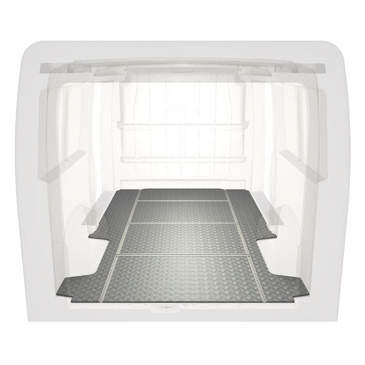 Lightweight and robust van floor with transverse rails for a Citroën Jumper / Peugeot Boxer / Fiat Ducato with anti-slip aluminum tread plate and cargo rails (longitudinal and transverse) for quick and safe installation of racking systems and other accessories.