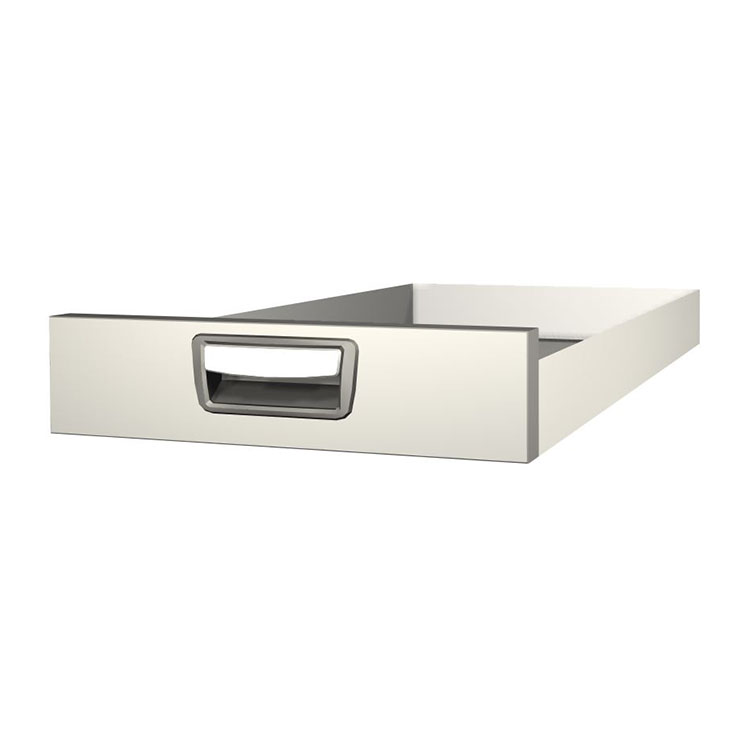 Robust extra-long drawer for assembly in a drawer unit frame. The drawer, made from aluminum, has ball bearings as standard and the mix of fixed and flexible bearings makes the drawer stable and easy to operate.