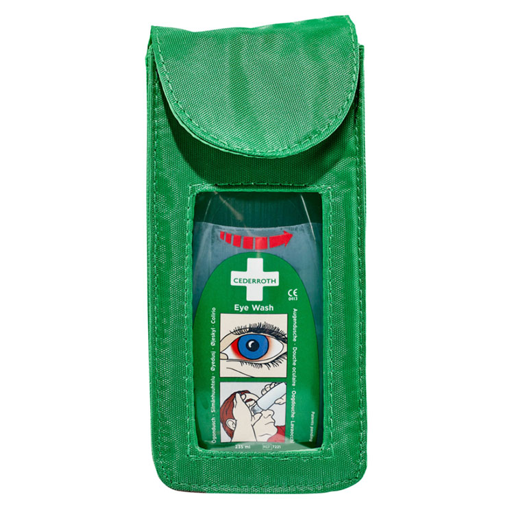 Green nylon holster, with belt loop. The holster enables a bottle of Cederroth Eye Wash Pocket Model to be carried easily on your belt.