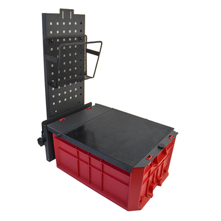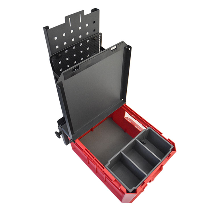 Mobile Office has a large storage space and a lid with anti-slip surface. A plastic liner for the base, an insert for smaller equipment, a magnet to hold papers and a storage pocket is included.