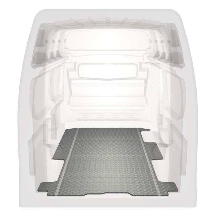 Lightweight and robust standard van floor for a Renault Trafic / Opel Vivaro / Fiat Talento / Nissan NV300 with anti-slip aluminum tread plate and cargo rails (longitudinal) for quick and safe installation of racking systems and other accessories.
