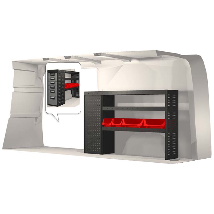 The racking has been specially designed to ensure the optimum fit to the vehicle, as well as the best possible functionality and safety. It has been developed for professional use, is flexible and is intended for service jobs in various types of business. All shelves are equipped with rubber mats, and all drawers with foam plastic liners. Assembly material is included.