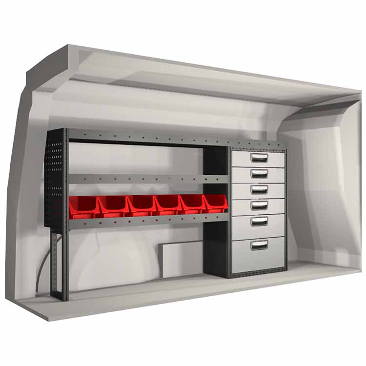 The racking has been specially designed to ensure the optimum fit to the vehicle, as well as the best possible functionality and safety. It has been developed for professional use, is flexible and is intended for service jobs in various types of business. All shelves are equipped with rubber mats, and all drawers with foam plastic liners. Assembly material is included.