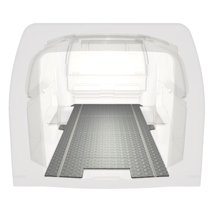 Lightweight and robust standard van floor for a Citroën Jumpy / Peugeot Expert / Toyota ProAce with anti-slip aluminum tread plate and cargo rails (longitudinal) for quick and safe installation of racking systems and other accessories.