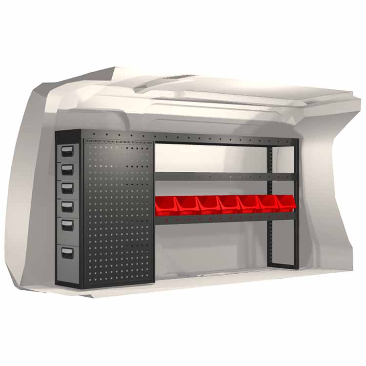 The racking has been specially designed to ensure the optimum fit to the vehicle, as well as the best possible functionality and safety. It has been developed for professional use, is flexible and is intended for service jobs in various types of business. All shelves are equipped with rubber mats, and all drawers with foam plastic liners. Assembly material is included.