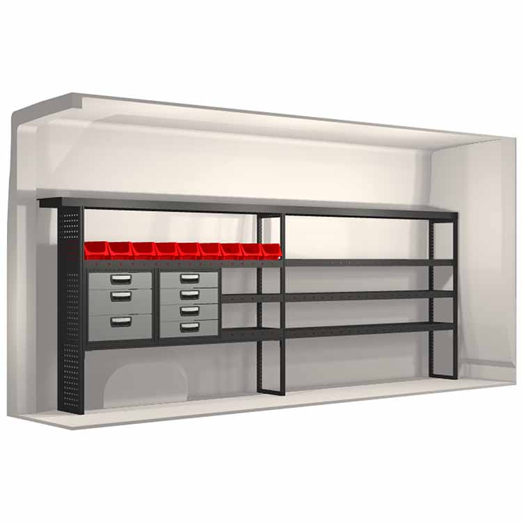 The racking has been specially designed to ensure the optimum fit to the vehicle, as well as the best possible functionality and safety. It has been developed for professional use, is flexible and is intended for service jobs in various types of business. All shelves are equipped with rubber mats, and all drawers with foam plastic liners. Assembly material is included.