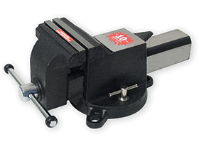 Cast steel vice with a jaw width of 125 mm. The vice has an integrated swivel base and built-in jaws for pipes.