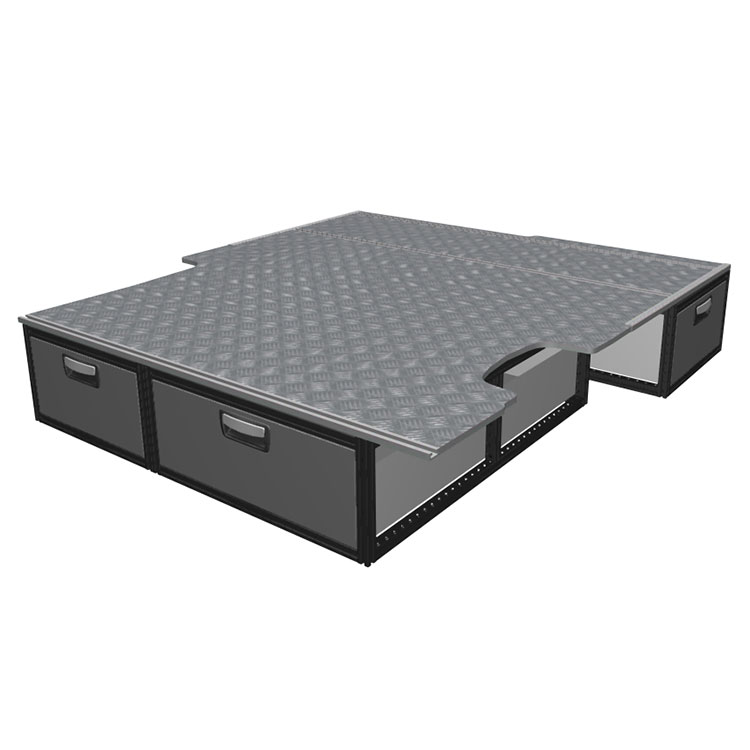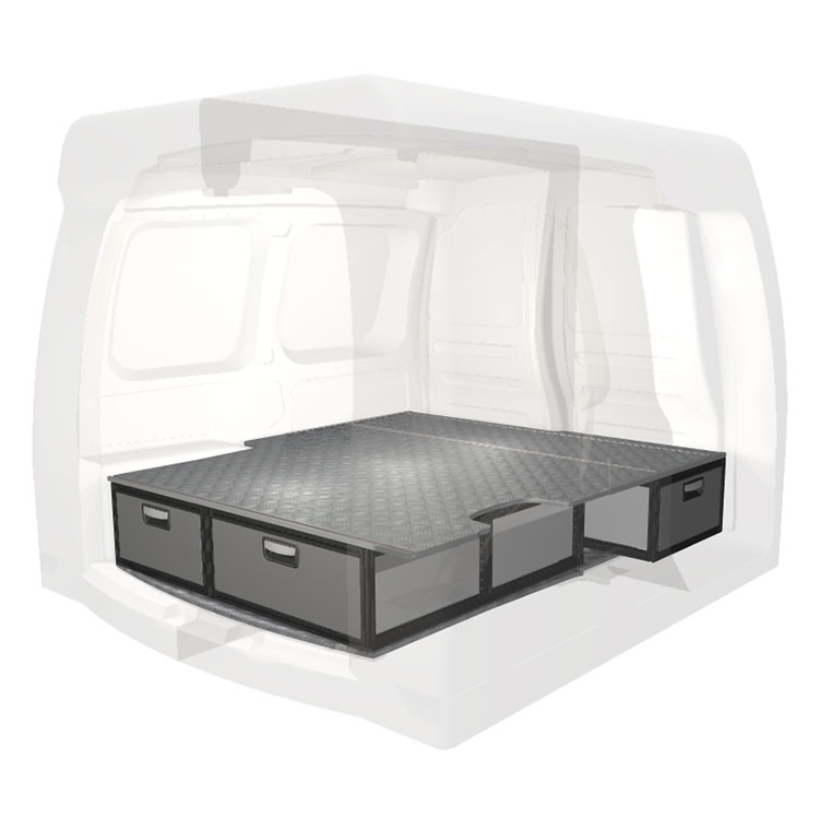 The kit is designed to be fitted on top of a Modul-Floor, utilizing the floor rails for a non-intrusive installation. The double floor is equipped with rails for easy installation of vehicle racking, and edging strips for a nice finish.
