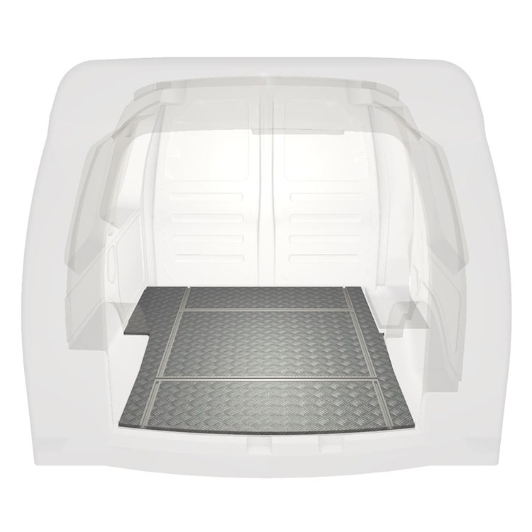 Lightweight and robust van floor with transverse rails for a Volkswagen Caddy with anti-slip aluminum tread plate and cargo rails (longitudinal and transverse) for quick and safe installation of racking systems and other accessories.