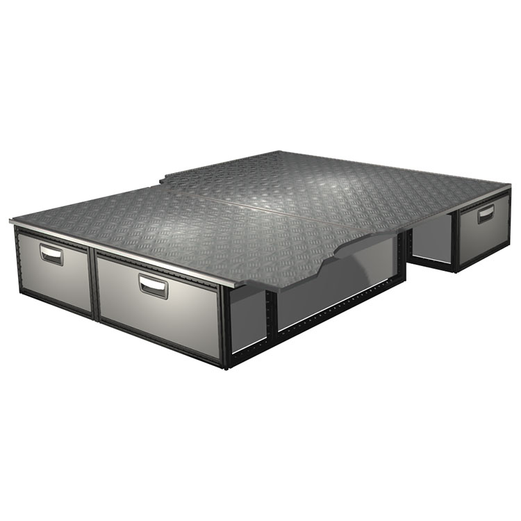 The kit is designed to be fitted on top of a wooden floor. The double floor is equipped with rails for easy installation of vehicle racking, and edging strips for a nice finish.